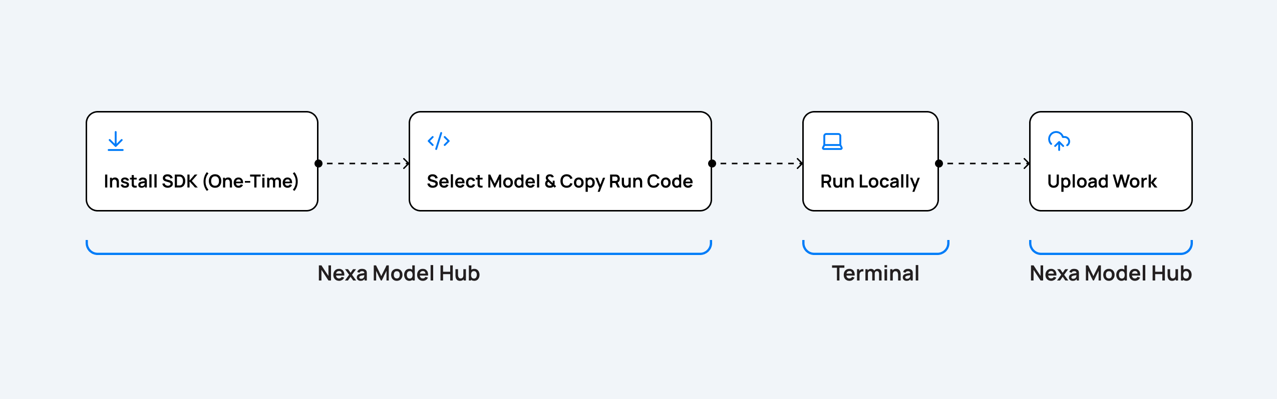 Instead of jumping across 5+ fragmented tools, developers can now discover, run, and share models in one seamless flow. Nexa Model Hub reduces setup friction, guides users at each step, and closes the loop by bringing projects back into the community.